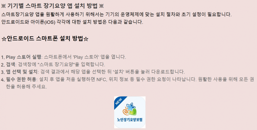 6월 23일 새로운 '스마트 장기요양' 앱이 출시되어 새로운 버전으로 설치하셔야 지속적으로 내용확인이 가능하여 설치방법 및 사용안내를 해 드리려 합니다. 위 방법을 잘 확인하시고 설치부탁드리며, 문의사항이 있으시면 언제든지 연락주시기 바랍니다.